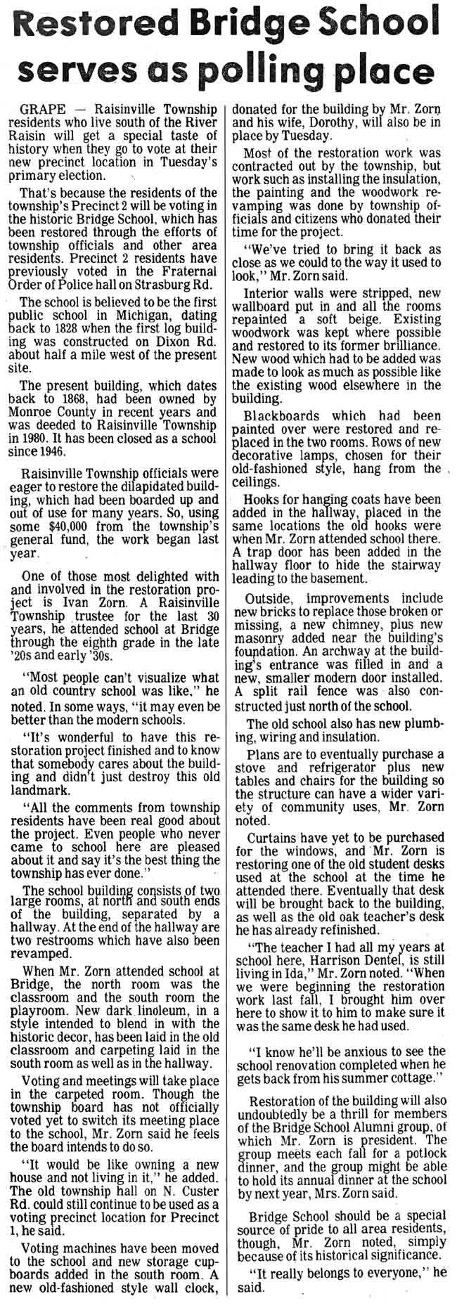 Following are several newspaper articles that appeared in Monroe County papers regarding events and history of the Bridge School.