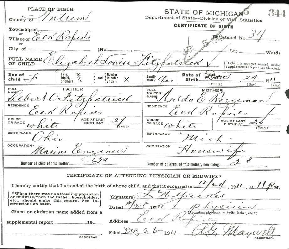 Birth Certificate for Elizabeth Louise Fitzpatrick