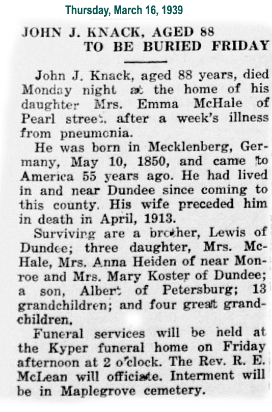 Anna in her newspaper obituary is listed as Knaack also. However, tracing her back into Germany finds her father's name is Knack and her Social Security application has her maiden name as Knack. Also, relatives who attended her funeral service all wrote their names as Knack. Anna originated from a different part of Germany than Rika, too. So, it would appear that Knack is the proper spelling.
